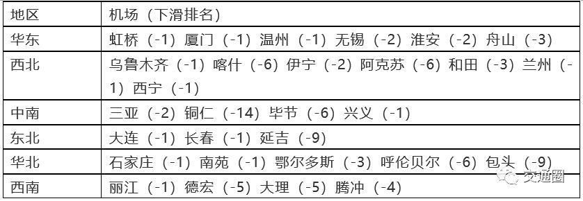 最后,将视野扩大到百万级,吞吐量排名下滑的机场整理如下